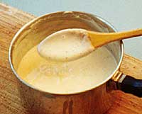 - Return to medium heat and add 1/4 cup of milk at a time. When milk is absorbed by the butter-flour mixture, add a little more increasing quantities as you go along.