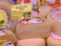 Provolone is an all-purpose cheese used for cooking, dessert purposes and even grating. It is traditional, creamery, stretched, curd cheese. This cheese appears in various shapes. The thin, hard rind is golden-yellow and shiny. Sometimes it is waxed. Provolne cheese can be of various types. Dolce (mild Provolne) is aged for two to three months, and it is supple and smooth with a thin waxed rind. It is generally used as a table cheese. Aged for six months to two years, it is darker with small holes and a spicy flavor.Traditional, creamery, whey cheese made from cow's or sheep's milk. It is a basin-shaped cheese, pure white and wet but not sticky. Good Ricotta should be firm, not solid and consist of a mass of fine, moist, delicate grains, neither salted nor ripened. It is white, creamy and mild and is primarily used as an ingredient in lasagna. It is primarily made with cow's milk whey which is heated to 170 degrees F. Citric acid is added to encourage destabilization and separation and the temperature is quickly raised to 185 degrees F. Proteins from the whey separate rise and coagulate; the proteins (lactalbumin) are skimmed off and put in a wicker basket to drain for two days after which the "cheese" is ready for market. There are three distinct varieties of ricotta: ricotta salata moliterna (ewe's milk whey), ricotta piemontese (cow's milk whey + 10% milk) and ricotta romana (a byproduct of Romano cheese production).