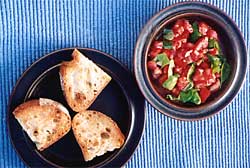 ALTERNATIVELY, place the tomatoes, basil, garlic (chopped fine), olive oil and salt in a bowl and mix. Set bowl at table alongside the toasted bread and simply spoon on mixture.Some prefer to use sliced rather than chopped tomato. Whichever way you serve it, it is delicious.