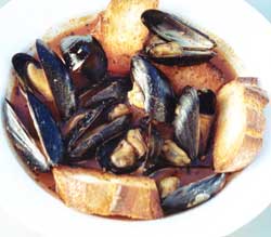 You can use mussels, small clams or both in this deliciously satisfying soup, served in individual bowls. One more way to use up leftover bread. Serve it with a green salad and some extra toasted bread and there you have it.